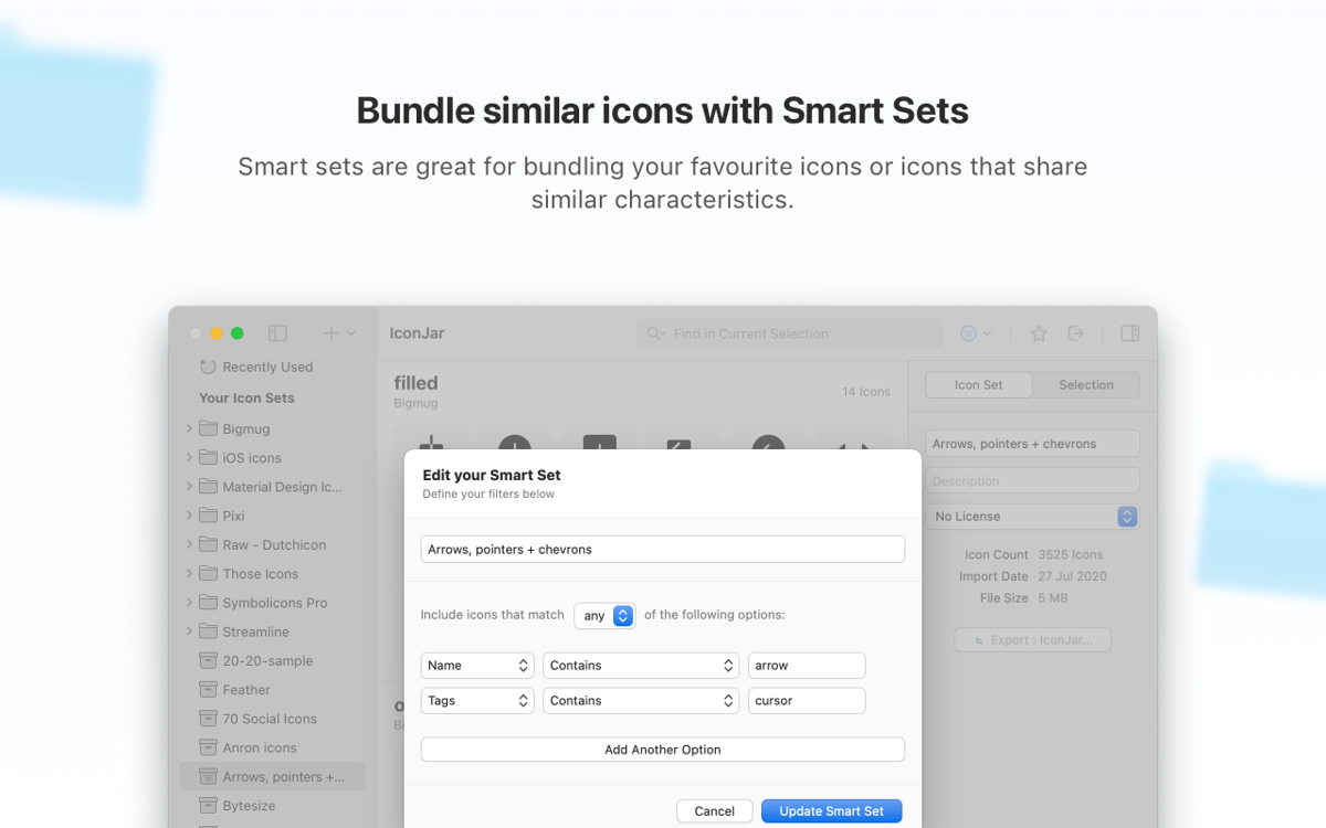 Se hai un insieme di icone che ti sembra un po' fuori moda, puoi aggiornare rapidamente l'intero pacchetto o solo determinati elementi. Seleziona le icone che vuoi sostituire in gruppo. Puoi anche personalizzare la descrizione e i metadati delle icone: le nuove informazioni verranno unite all'istante a quelle esistenti.