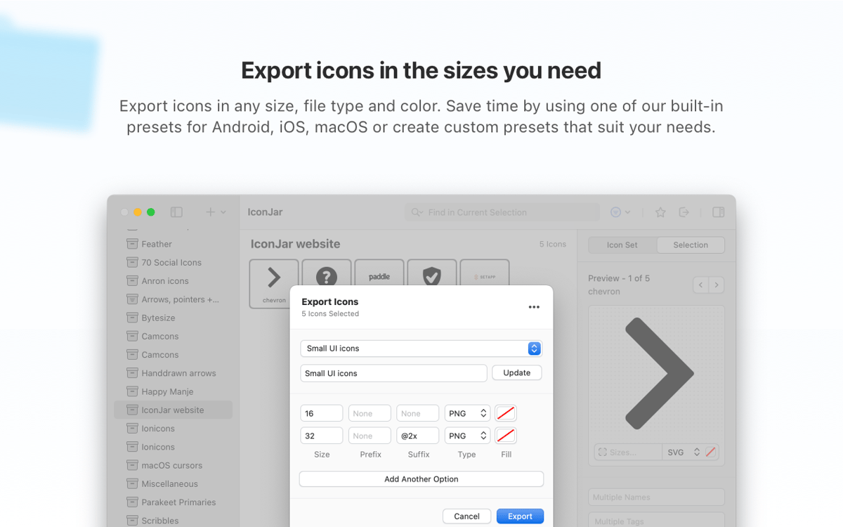 Diffondi le tue splendide icone: la funzionalità di esportazione di IconJar è semplicissima. Devi solo individuare la icone necessarie, specificarne le dimensioni ed esportarle in PNG, TIFF, WebP, GIF, SVG o JPEG. Per semplificare ulteriormente il flusso di lavoro, puoi usare i preset integrati.