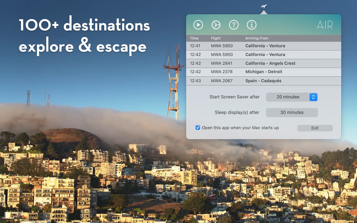 Magic Window Air ti offre un salvaschermo con video aerei in versione slow-motion. Siediti e lasciati che il tuo Mac ti porti in giro per il mondo. L'app include un plugin per salvaschermo e un'app per la barra dei menu (Airport) con informazioni sull'ultima destinazione.