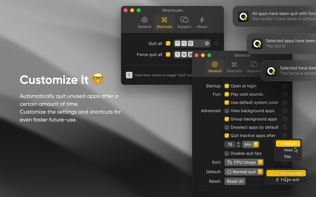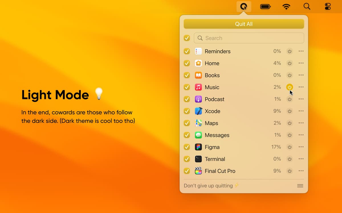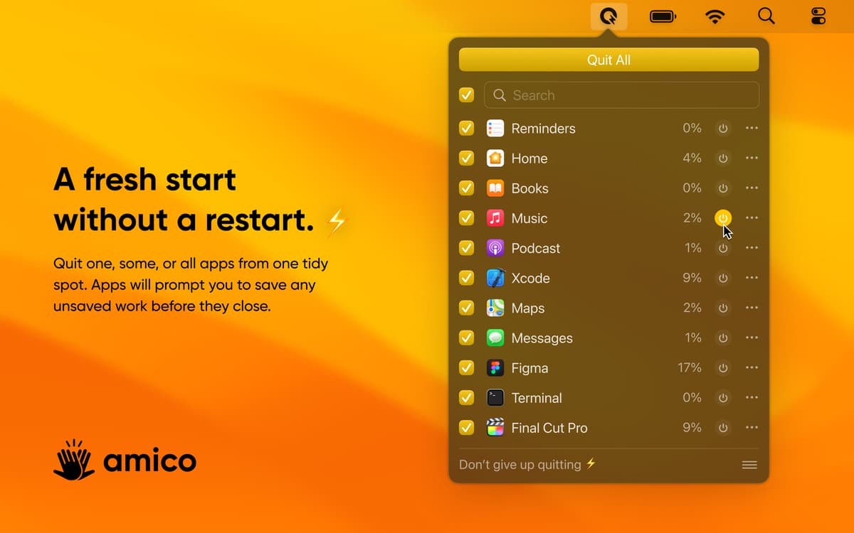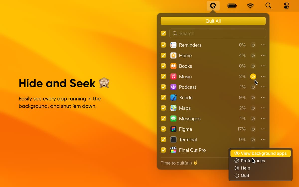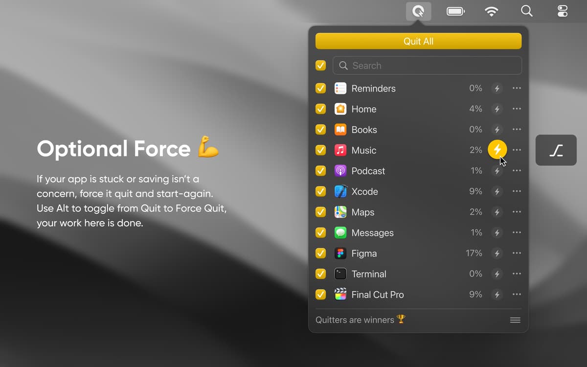 Usa la funzionalità di Quit All, che ti consente di visualizzare tutte le app in esecuzione in background e decidi se vuoi chiuderle o mantenerle aperte. Esci facilmente dalle app in background grazie all'assistente di Quit All nella barra dei menu.