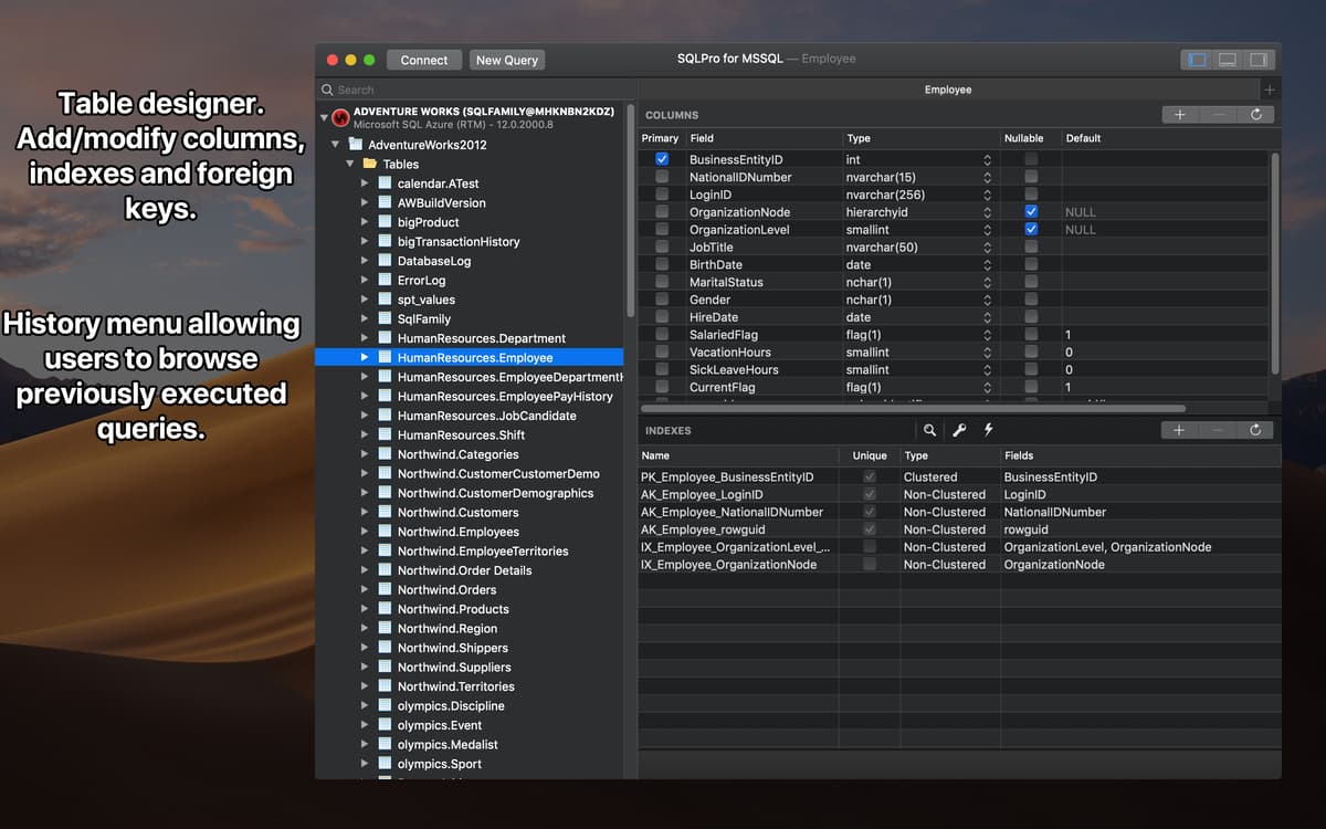 SQLPro Studio ha tutto ciò che ti occorre per la gestione del database. Ti consente di creare o aggiornare le tabelle senza sforzi e di rilevare qualsiasi tipo di errore di sintassi in pochi secondi; eventuali errori presenti vengono infatti evidenziati. Inoltre, dispone anche di una pratica funzionalità di completamento automatico.
