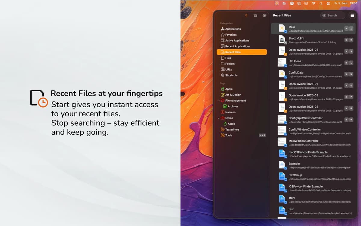 Una volta installata, start organizzerà tutte le tue app sotto varie etichette, come ad esempio: Apple, Office, Sviluppo, e così via. Puoi cercare tramite queste raccolte predefinite oppure personalizzarle come preferisci. L'app offre anche accesso rapido alle applicazioni usate di recente.