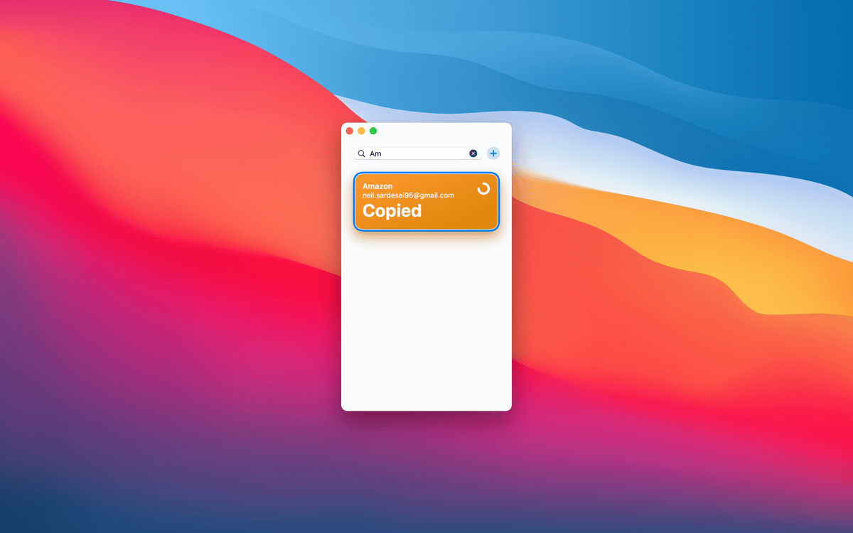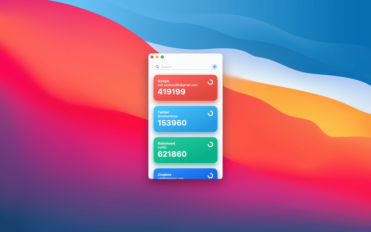 Ogni account viene mostrato come scheda con nome, e-mail e codice per la verifica in due passaggi. Step Two ti suggerisce automaticamente un colore personalizzabile per ogni account, così ti sarà sempre facile trovare quello che cerchi. Dopo aver trovato l'account desiderato, fai clic per copiarne il relativo codice per la verifica in due passaggi.
