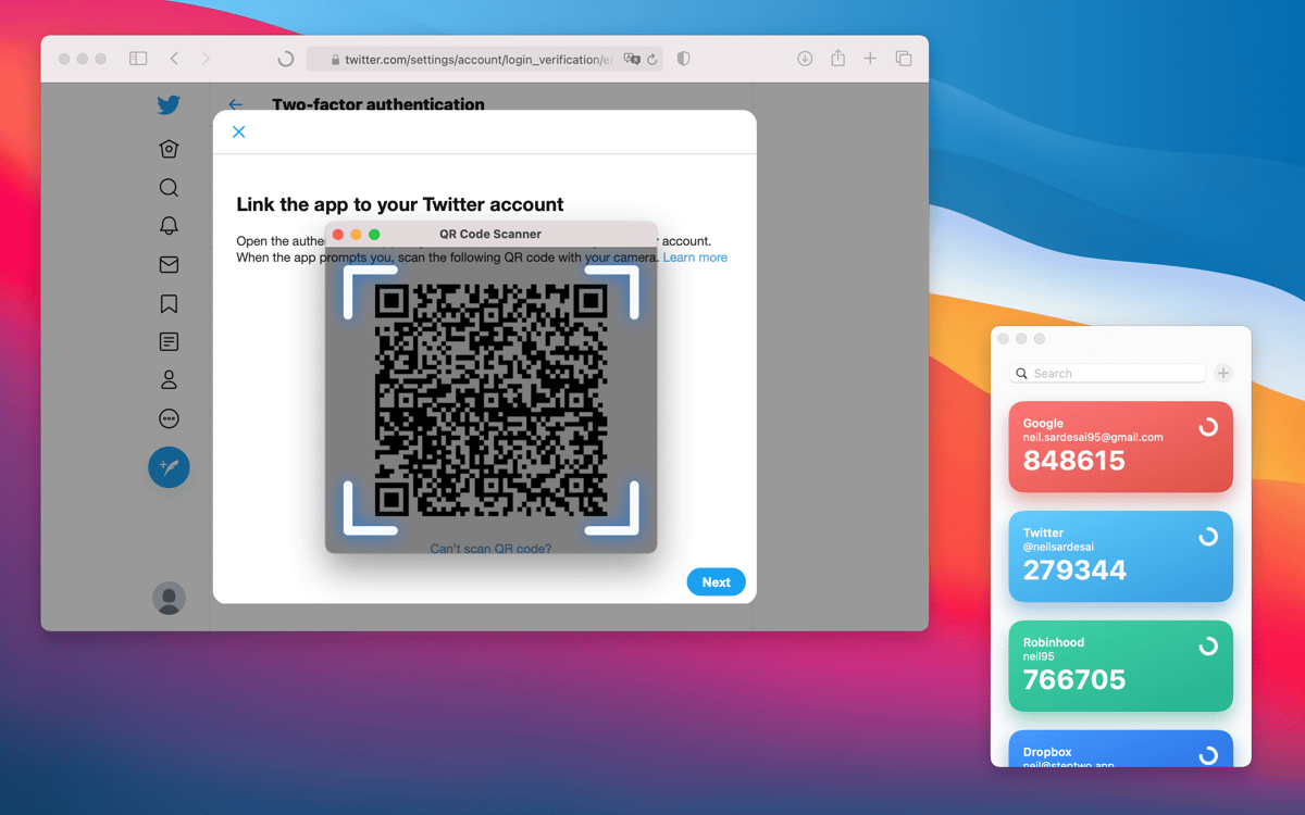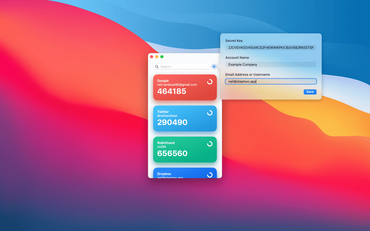Ossia quelli di Amazon, Google, Twitter e qualsiasi altro account online che usa password TOTP (Time-based One-Time Passwords) per la verifica in due passaggi. E se usi Step Two come parte di un abbonamento Setapp, non ci sono limiti al numero di account che puoi aggiungere, che siano poche decine o centinaia.