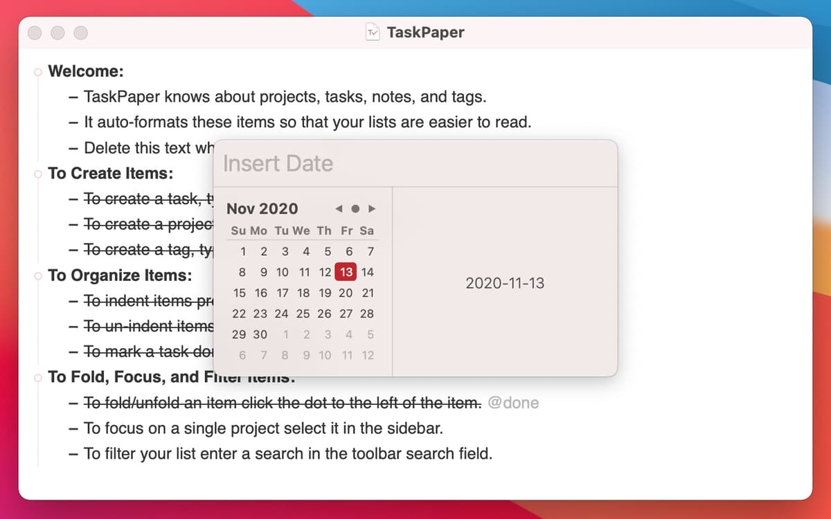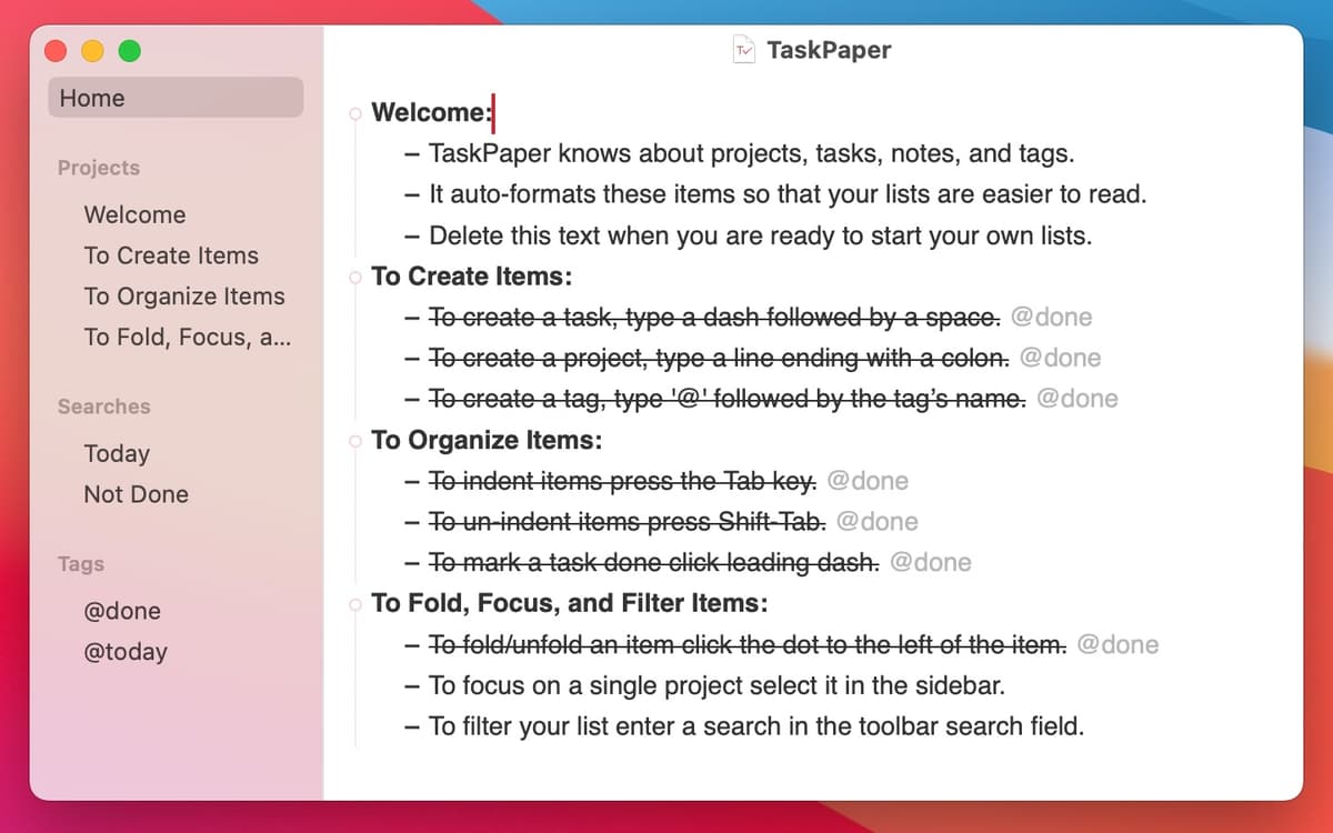 TaskPaper include quattro entità: progetti, attività, etichette e note. Le etichette sono perfette per organizzare le varie voci. Puoi utilizzarle per dividere le attività in base a lavoro (@work), priorità (@priorities) e altre categorie. Gli elenchi possono essere compressi o espansi per una migliore visione del progetto. Ti servono altri sotto-livelli? Devi solo premere il tabulatore.
