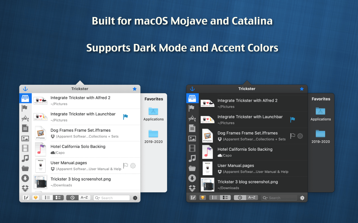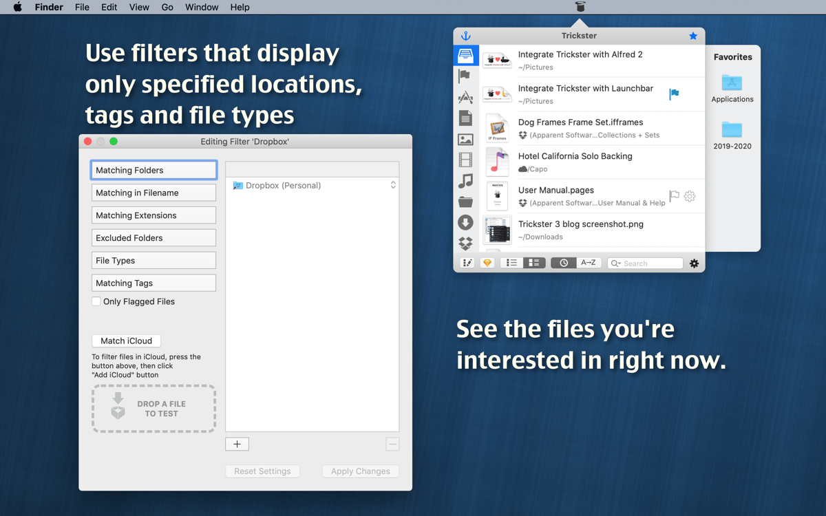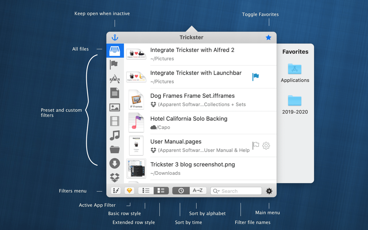 Trickster è il tuo giubbetto salvagente sul Mac: una comoda app per la barra dei menu che tiene traccia di ogni file, app e cartella su cui hai lavorato di recente. Scegli il tipo di file da vedere e lascia che sia l'app a ricordarsi degli elementi in questione: non dovrai fare copia-incolla né spulciare interminabili elenchi di elementi scaricati.