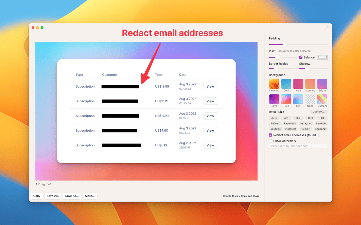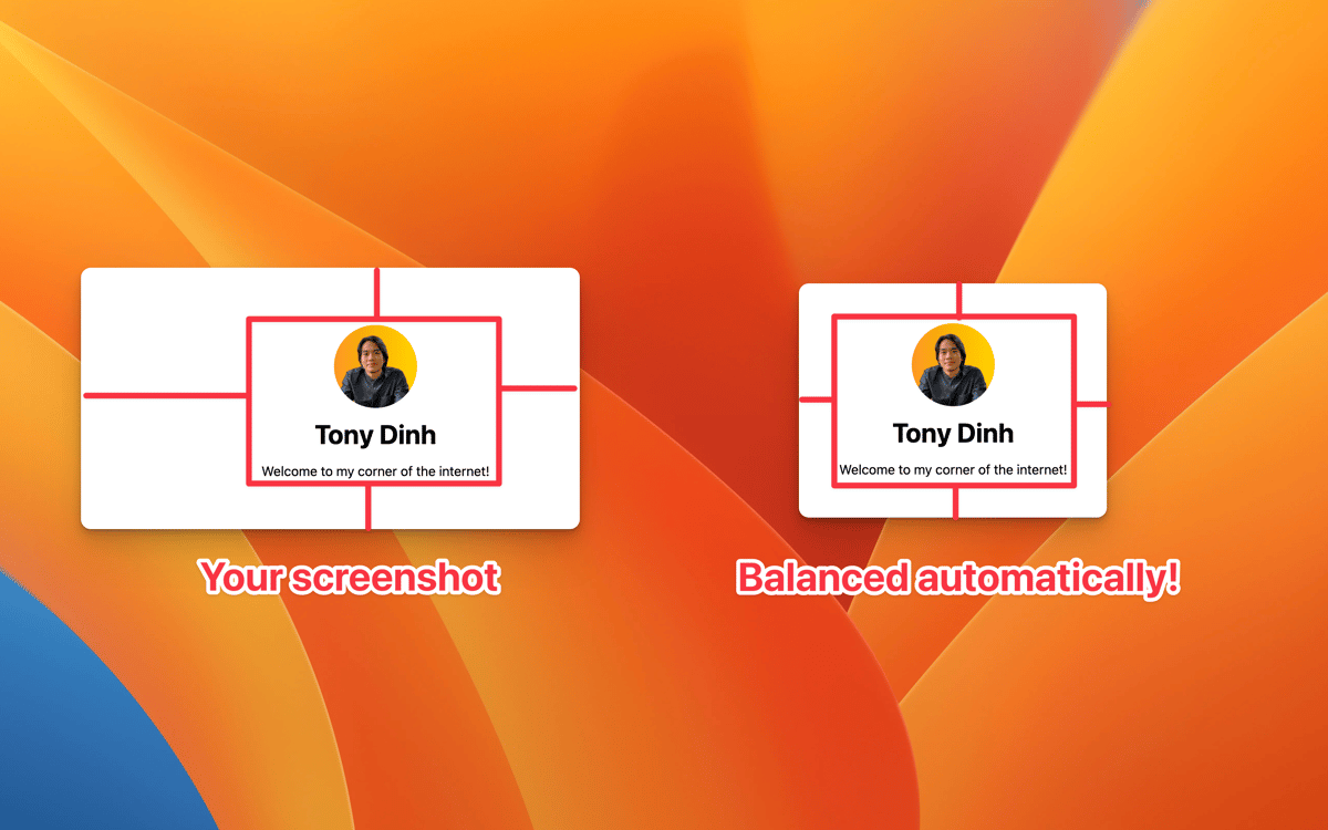 Gli screenshot più belli sono screenshot centrati. Xnapper offre una serie di opzioni semplici e veloci per personalizzare i tuoi screenshot, compreso un pratico strumento di bilanciamento. Centra il tuo screenshot su uno sfondo con un semplice clic. Puoi modificare il raggio del bordo del tuo screenshot, aggiustarne l'ombra o il padding.