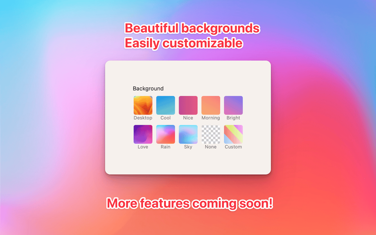Vuoi condividere screenshot più eleganti, ordinatamente centrati su un bello sfondo, con angoli arrotondati o con una filigrana? Xnapper è quel che fa per te! L'app consente di creare screenshot immediatamente condivisibili. Cattura, adatta, condividi: cambia lo sfondo dello screenshot, rimuovi le informazioni personali, cambia il rapporto d'aspetto dell'immagine e molto altro ancora.