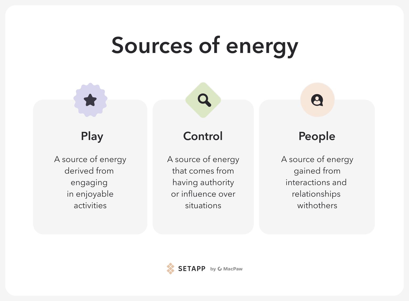 Ali identifies three main sources of energy (so-called energizers): Play, Control, and People. Let me explain.