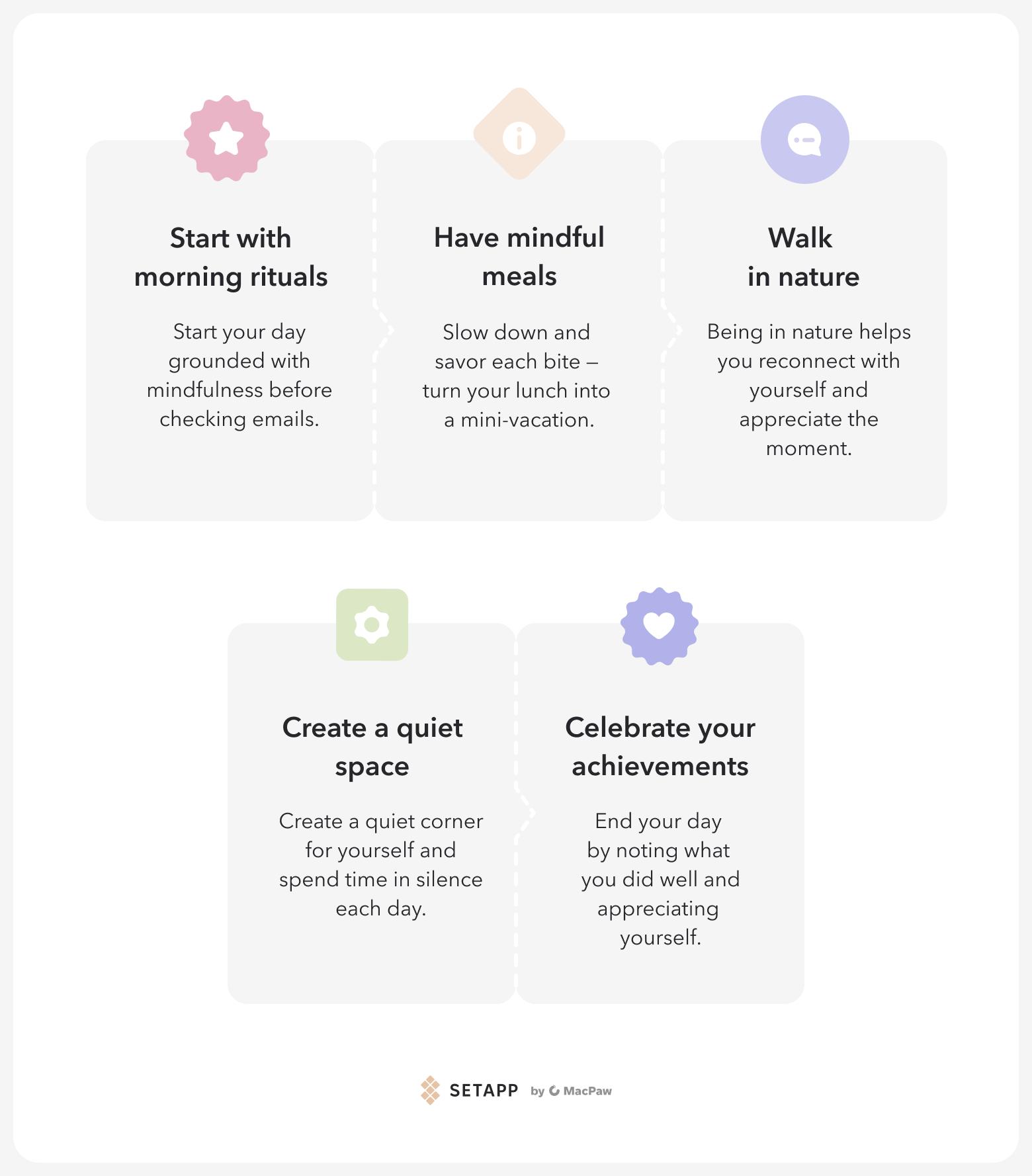 Start with morning rituals | Start your day grounded with mindfulness before checking emails. |