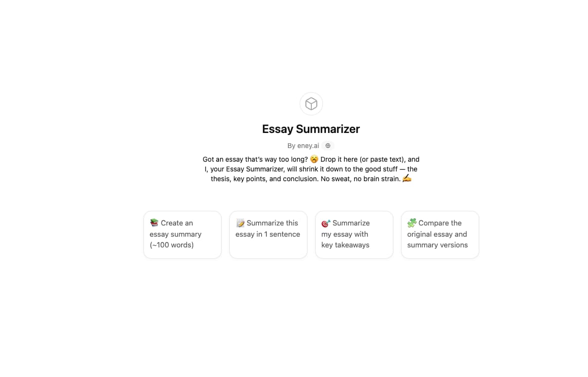Just drop your essay into the Essay Summarizer (a free GPT assistant), and it’ll instantly compress it into a concise version. You can extract key takeaways, generate a 100-word or one-sentence summary. I live to use it to compare my original essay with my own summary to see how well they match. The assistant works with text pasted directly into the search field, as well as common GPT-approved file types like PDF, TXT, and images.