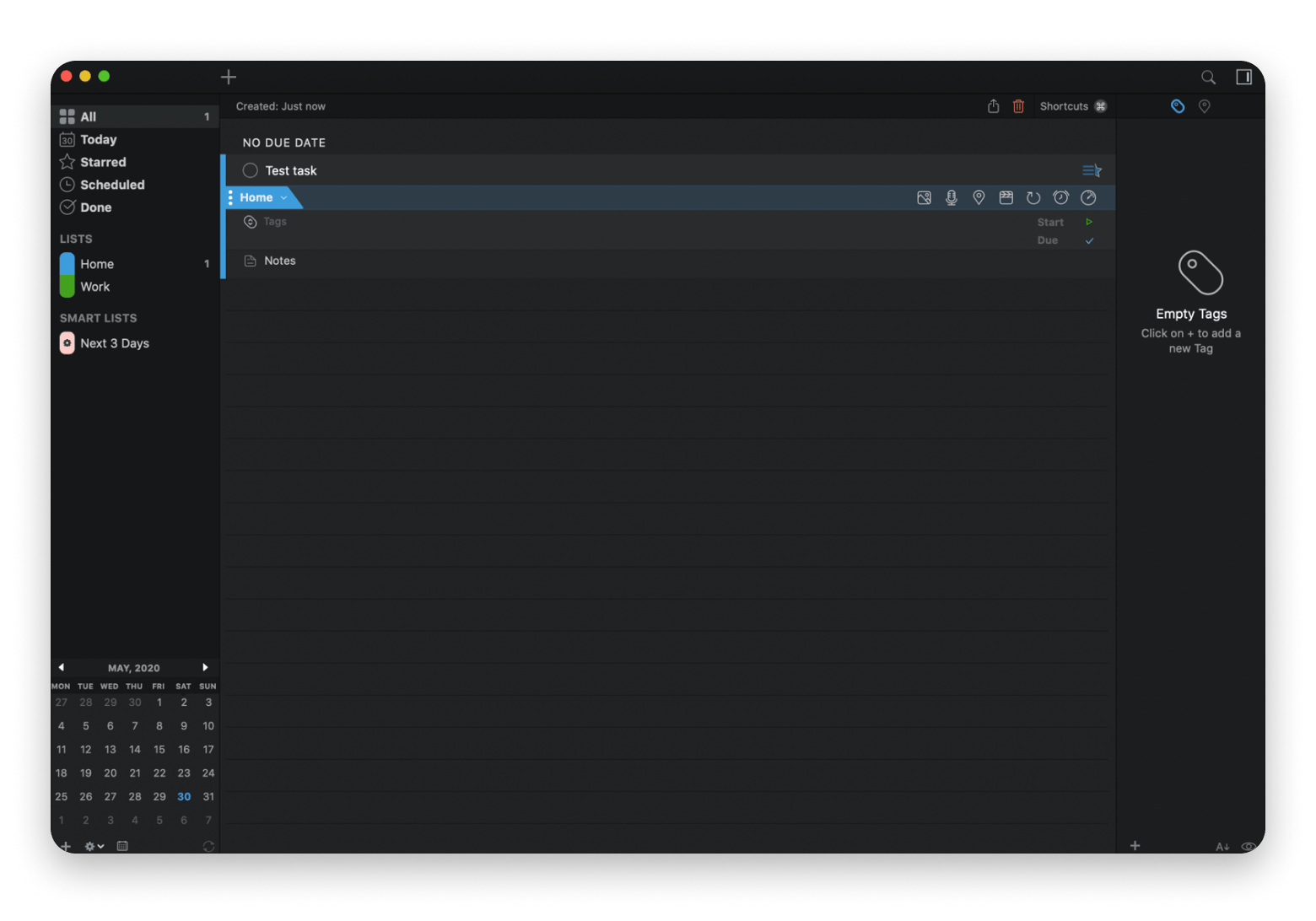 When you add a task, 2Do lets you add or manage tags for the task, add a picture or voice note, set alerts and duration, and schedule it to repeat as needed.