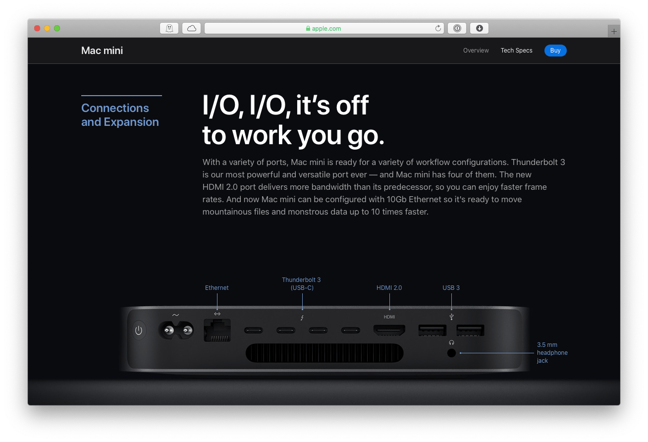 For those who’ve never seen a Mac mini before, it’s essentially a small square box, measuring 7.7 x 7.7 x 1.4 inches (similar in shape but slightly larger than Apple TV), that now only comes in Space Gray color (same color as in MacBooks or iMac Pro). It’s got a variety of ports to connect any external devices (e.g. a monitor, a keyboard) and can be used anywhere, from being your everyday computer to a part of a solid server infrastructure.