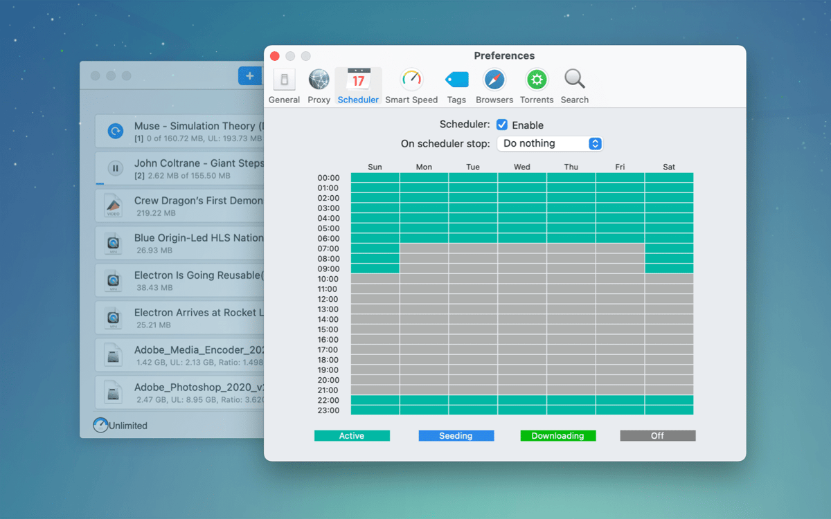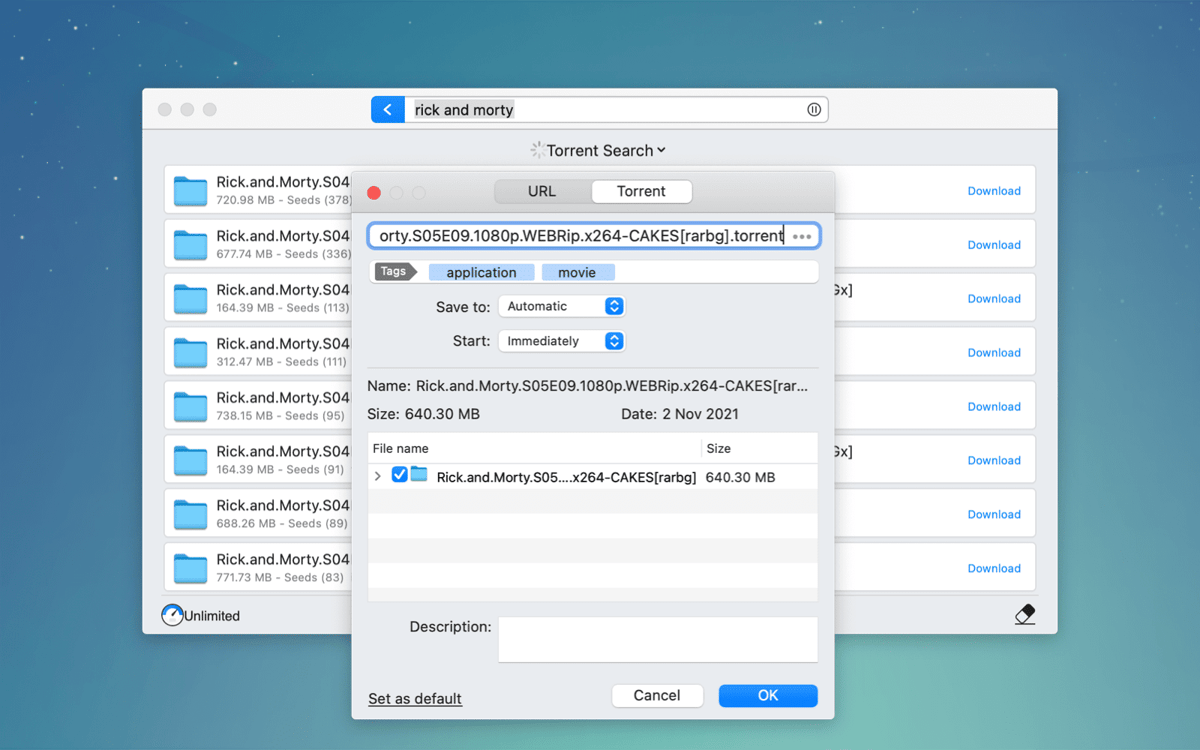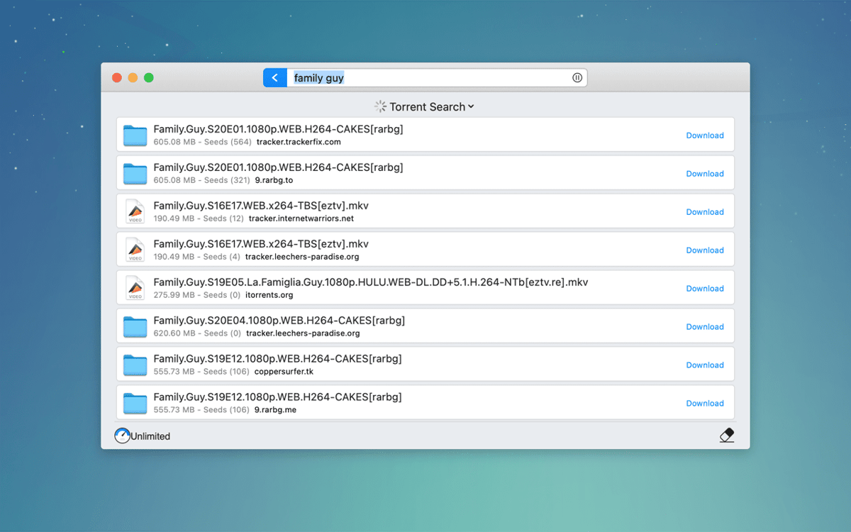 You don’t have to look for torrents on the web, trying to figure out which to download. Folx Pro will find anything you need, sort it by the number of seeds, and let you save the file directly, in one click. You can also schedule the download for later.