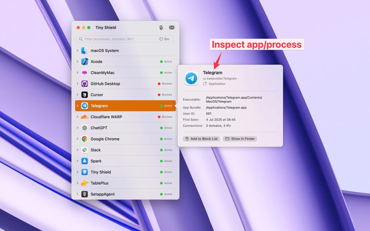 If you spot a website or app you don’t want, just select it and click to block. It’s fast to stop unwanted traffic and protect your Mac with Tiny Shield.