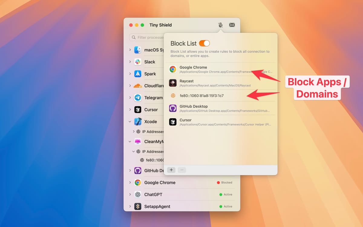 Your Mac constantly communicates with websites and apps. Tiny Shield lets you watch every connection and block anything suspicious.