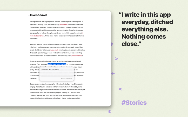 Quando você precisa se concentrar nas suas ideias, o Ulysses praticamente se transforma em uma folha de papel em branco para que você não se distraia com mais nada. Escreva com tranquilidade – a formatação pode ficar para depois.