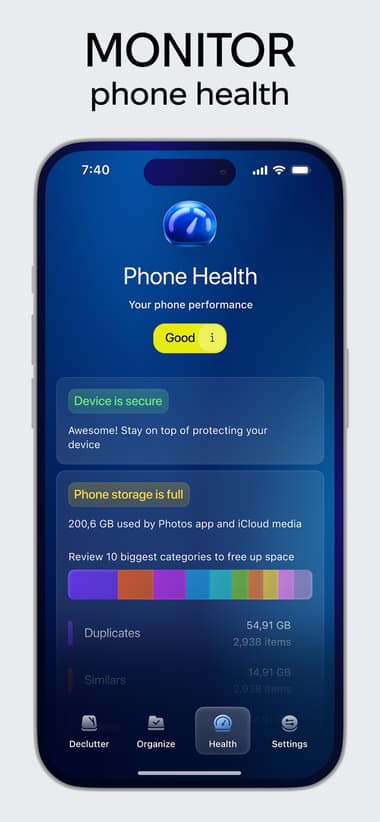 Ваша фототека може швидко заповнюватись непотрібними речами: розмитими фотографіями, додатковими кадрами однієї й тієї ж сцени, а також великими відео. CleanMy®Phone сканує всю фототеку в пошуку непотрібних речей та допомагає звільнити місце, таким чином ви зможете зручніше шукати та переглядати ваші відео та фото. А що найприємніше? Ви можете очищати фототеку, поки нудьгуєте в літаку або просто не маєте інтернету: CleanMy®Phone не потребує підключення. Ключові функції CleanMy®Phone