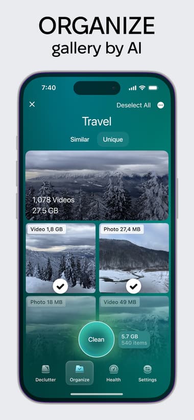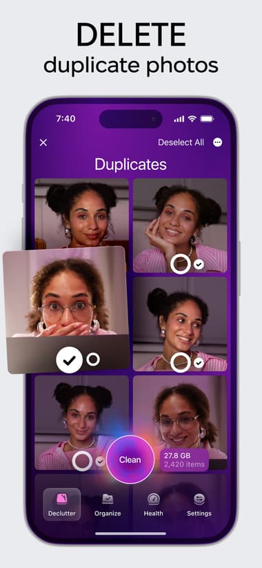 Більше не треба переглядати нескінчені списки дублікатів та майже ідентичних кадрів. CleanMy®Phone поможе знайти та видалити їх лише за кілька дотиків. Тому що кому взагалі потрібні 5 варіантів позавчорашнього казкового заходу сонця? Зберігайте лише найкращі кадри й звільніть місце для нових спогадів.