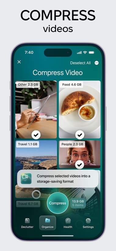 Починає бракувати місця через довгі відео? CleanMy®Phone дозволяє стискати будь-яке відео з мінімальними втратами якості. Миттєво звільняйте місце, щоб зберігати більше улюблених речей на вашому iPhone.