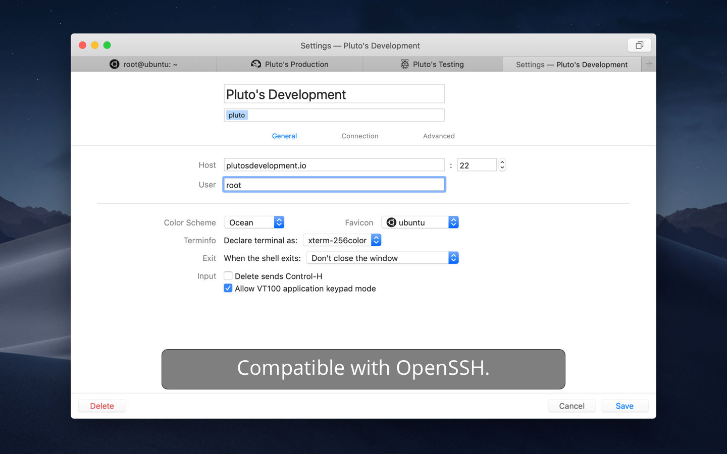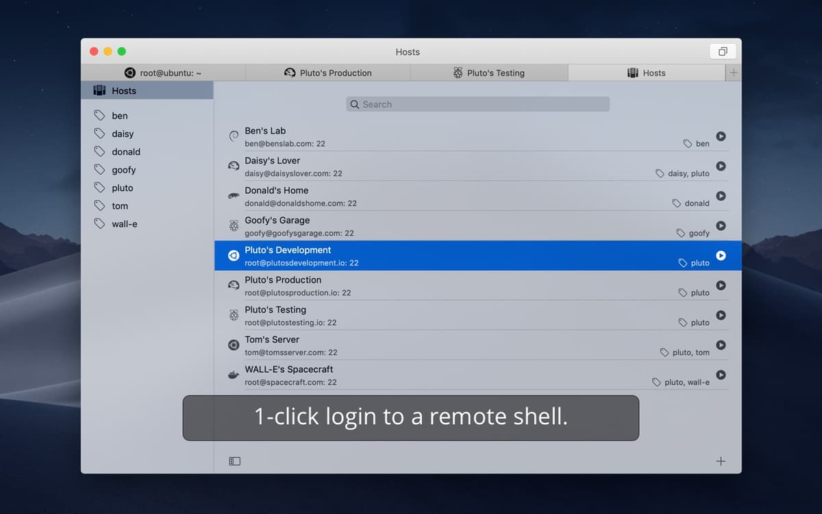 Професійно перемикайтеся між безліччю хостів за допомогою Core Shell. Цей повнофункціональний термінал для Mac дозволяє налаштовувати з’єднання, отримувати доступ до розширених функцій – від переходу через проксі-сервер до переадресації агентів, а також упорядковувати хости за тегами для зручності. Найестетичніша сторона історії: ви можете встановити спеціальну схему кольорів для свого SSH-клієнта.