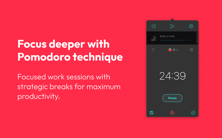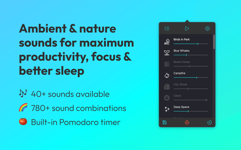 Не можете думати без заспокійливої фонової музики? Використовуйте цю чудову програму, щоб підвищити продуктивність. Виберіть, якими звуками природи ви хочете насолоджуватися, і виконуйте робочі завдання швидше та з більшим ентузіазмом.