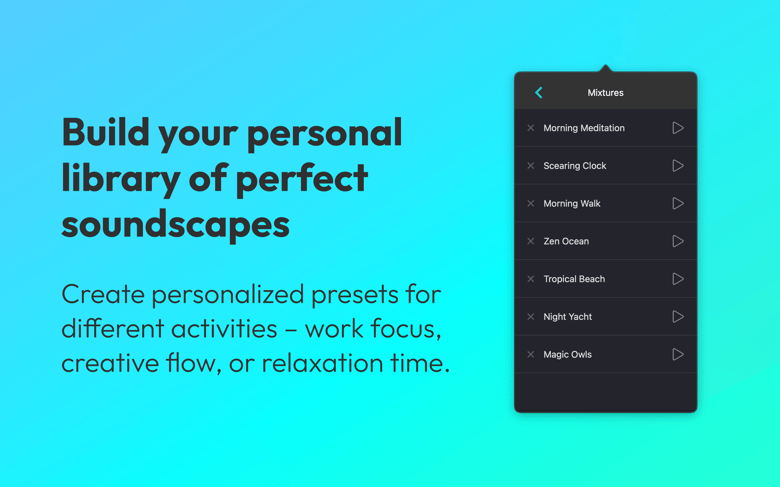 Просто уявіть: звуки дощу та камін ідеально поєднуються. Змішуйте тони між собою, щоб отримати те, що вам справді сподобається. Підібрали саме те, що потрібно? Збережіть це поєднання в один клік і насолоджуйтеся ним в будь-який час.