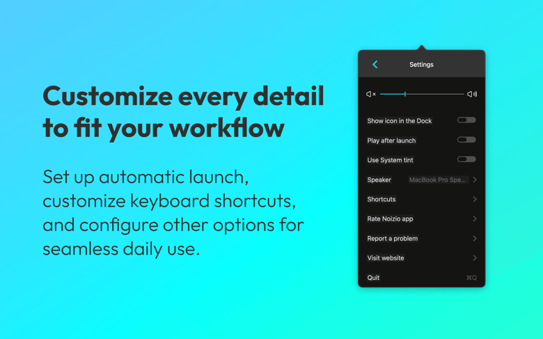Любите легку звукову атмосферу? Обожнюєте звуки дощу, хвиль чи каміна? Шукаєте гарну програму, що запропонує музичну атмосферу для розслаблення? Ви вже знайшли Noizio. Програма включає звуки навколишнього середовища та мотиви для зниження напруги, пропонуючи мінімалістичний та елегантний дизайн. Ви можете сидіти в офісі та насолоджуватися звуками багаття, ніби ви перебуваєте біля справжнього каміна. Займайтесь робочими питаннями у приємніший спосіб. Або ж просто розслабтесь і дайте своєму розуму відпочити в затишній звуковій атмосфері.