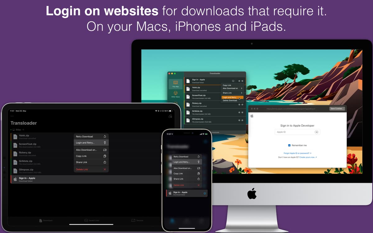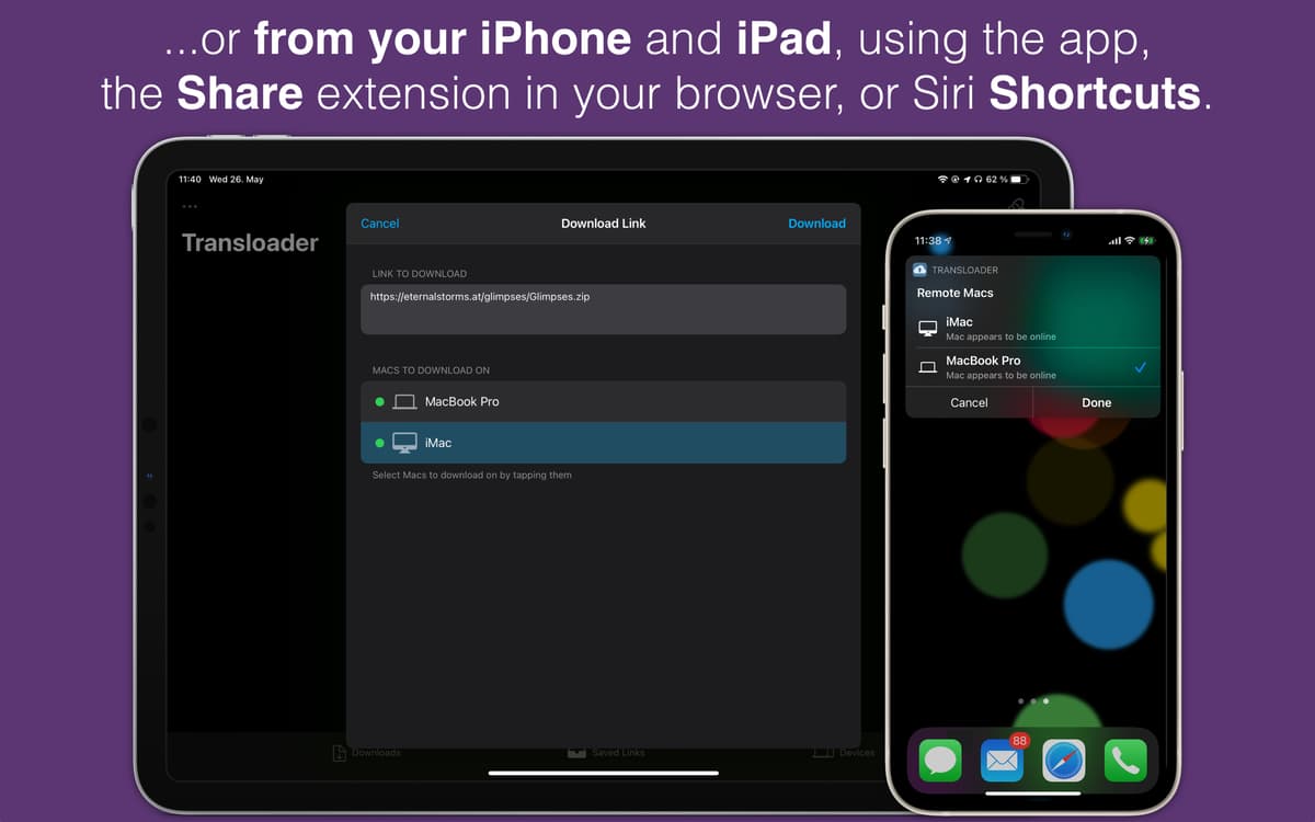 Розпочинайте завантаження на Mac дистанційно — просто перекидайте посилання для завантаження в програму Transloader з вашого iPhone, iPad або іншого Mac. Призначте завантаження одному зі своїх комп’ютерів Mac, щоб розпочати викачування файла, навіть не знаходячись за робочим столом! Після завершення Transloader повідомить вам про це зручним сповіщенням.